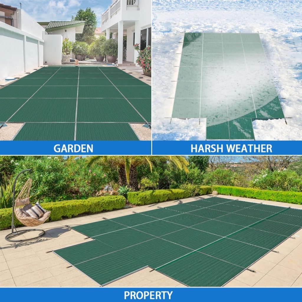 For your off season, consider a pool safety cover. This cover from iCover secures tightly on top of the pool to prevent pooling on top of the cover as well as preventing debris from entering the pool over the winter. It comes in several sizes, can accommodate a center step, and either blue or green.